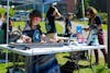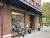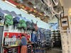 Ella Erickson working at a desk at the WWU Outdoor Center on April 28, 2025. Above her hangs assorted backpacks and bike tires, and to her right is the ski gear. // Photo by Quincy Koch