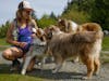 Galbraith Trail Hounds hiker Jenn Radford feeds a dog a treat on April 29, 2025, at Galbraith Mountain in Bellingham, Wash. Radford uses treats to reinforce commands she gives to the dogs. // Photo by Ben Magnus