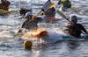 Two kayak polo players fight for the ball at Marine Park in Bellingham, Wash., on April 23, 2025. Expect to get wet when playing the sport. // Photo by Brady Rufner
