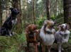 A group of dogs sit in a pack, holding still for a treat on April 29, 2025, at Galbraith Mountain in Bellingham, Wash. Galbraith Trail Hounds hikers use treats to gather the dogs. // Photo by Ben Magnus