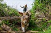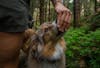 Galbraith Trail Hounds hiker Jenn Radford kneels down to dish out some pets on April 29, 2025, at Galbraith Mountain in Bellingham, Wash. After hiking for Trail Hounds for two years, Radford has developed relationships with many of the dogs.