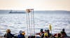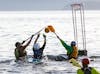 The ball goes in the hoop designed by Gary Southstone, founder of Kayak Polo Bellingham at Marine Park in Bellingham, Wash., on April 23, 2025. This is how a point is scored. // Photo by Brady Rufner