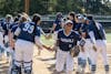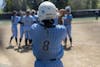 The Vikings celebrate a walk-off single from freshman Nyree Johnson on April 26 at Viking Field. Johnson has been consistent for the Vikings with a .290 batting average in 69 at-bats. // Photo by Chayton Engelson