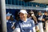 Sophomore Maleah Andrews watches her team in a huddle on April 26 at Viking Field. Andrews holds a .500 batting average, ranking second in Division II Softball. // Photo by Chayton Engelson