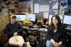 Milo Fisher, left, and Sylvia London, the current KUGS music directors, in their office at the Viking Union in Bellingham, Wash., on Feb. 20, 2026. They spend their work days organizing a volunteer schedule and sorting through music submissions. // Photo by Katherine Rogers