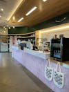 Drinks and pastries line Daytrip Cafe's vibrant, pink-tiled coffee bar on Feb. 17, 2026. The cafe sells house-made chocolate chip cookies, gluten-free coffee cake and croissants sourced from wholesale bakery Lamination Station. // Photo courtesy of Aaliyah Synn