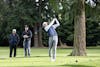 David Sibbett drives the ball far while Director of Golf, Luke Bennett, and Men’s Golf Captain, Peter Yahr, watch at Bellingham Golf and Country Club on April 10, 2025. Sibbett was recruited early in his junior college golf career to play for him at Western. // Photo by Chayton Engelson