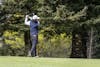 David Sibbett calmly prepares to swing to start a drive at Bellingham Golf and Country Club on April 10, 2025. Director of Golf, Luke Bennett, and Men’s Golf Captain, Peter Yahr, look on in the background // Photo by Chayton Engelson