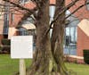 A sign at the base of the dawn redwood outside the Whatcom County Courthouse detailing its history on Feb. 25, 2025, in Bellingham, Wash. The sign cites this dawn redwood as the largest in the United States. // Photo by DuPree Nugent