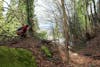 Chelan Howard, a LEAD volunteer, crouches to remove ivy from the site on Feb. 27, 2025, in Bellingham, Wash. The divot where the trail through the site will go can be seen to the right. // Photo by Jae Ranney