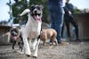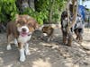 Three dogs in the outdoor area at Paws For A Beer in Fairhaven on July 29, 2023, in Bellingham, Wash. A dog is smiling in the foreground and two dogs are standing in the background. // Photo courtesy of Rylan Schoen