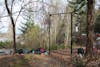 The entrance of the gate surrounding LEAD’s restoration project is lined with the backpacks of volunteers on Feb. 27, 2025, in Bellingham, Wash. The temporary gate helps keep local fauna away from the growing plants. // Photo by Jae Ranney
