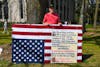 Andy Snow holds his fathers U.S. flag in protest at the “Hands Off!” rally in front of Bellingham City Hall on Saturday, April 5, 2025. Snow is a biology instructor at Whatcom Community College. // Photo By Caitlin Grygorcewicz