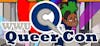 A superhero poses beside the Western Washington University QueerCon logo. This illustration was used to advertise QueerCon 2021. // Illustration courtesy of WWU QueerCon
